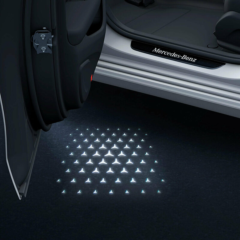 Die Einstiegsleisten im sportlich-exklusiven Mercedes-Benz oder AMG Design sind jedes Mal ein besonderer Blickfang, wenn sie beim Öffnen der Tür einladend leuchten. Ebenfalls faszinierend: die innovativen LED-Projektoren, die beim Öffnen von Fahrer- oder Beifahrertür den Mercedes Stern oder animierten Pattern auf den Boden im Einstiegsbereich projizieren.